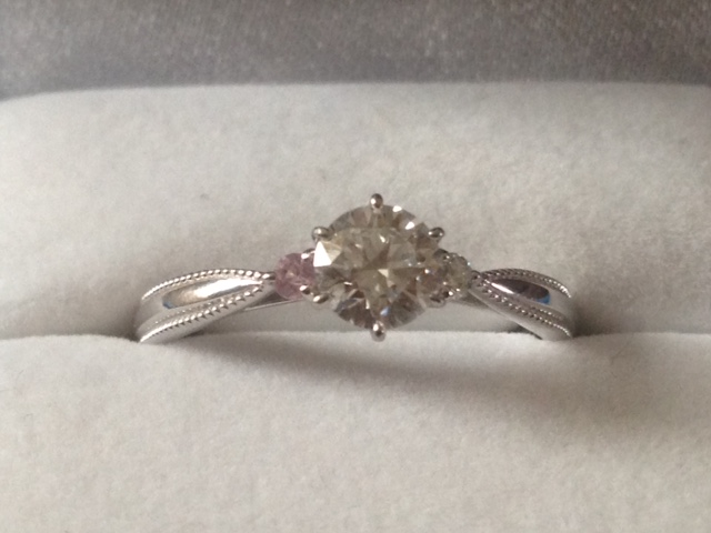 キャンペーンで内石をつけてくれたりサイドの石をカラーに変えたりもできたので真ん中ダイヤで左右の飾りをお互いの誕生石にしたりとオリジナル感も出せました。