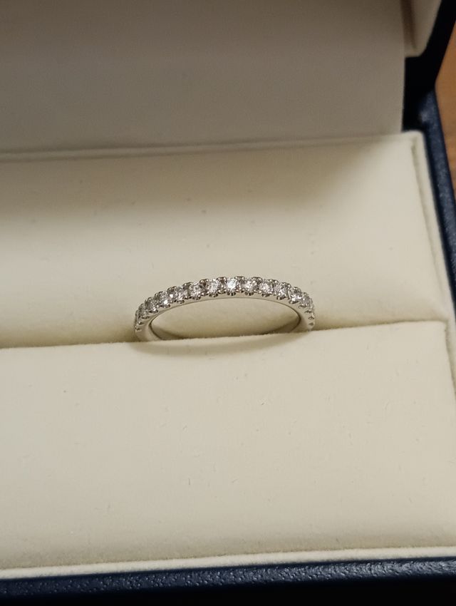 細身のハーフエタニティリングです。最初試着をしていた際、ダイヤが窮屈に見えない細身のデザインのハーフエタニティリングを求めていたのですが、ありませんでした。その旨店員さんに伝えたところ、求めていたデザインのファッションリングを持ってきてくださり、ブライダル用の素材で同じデザインのリングを作ってもらいました。