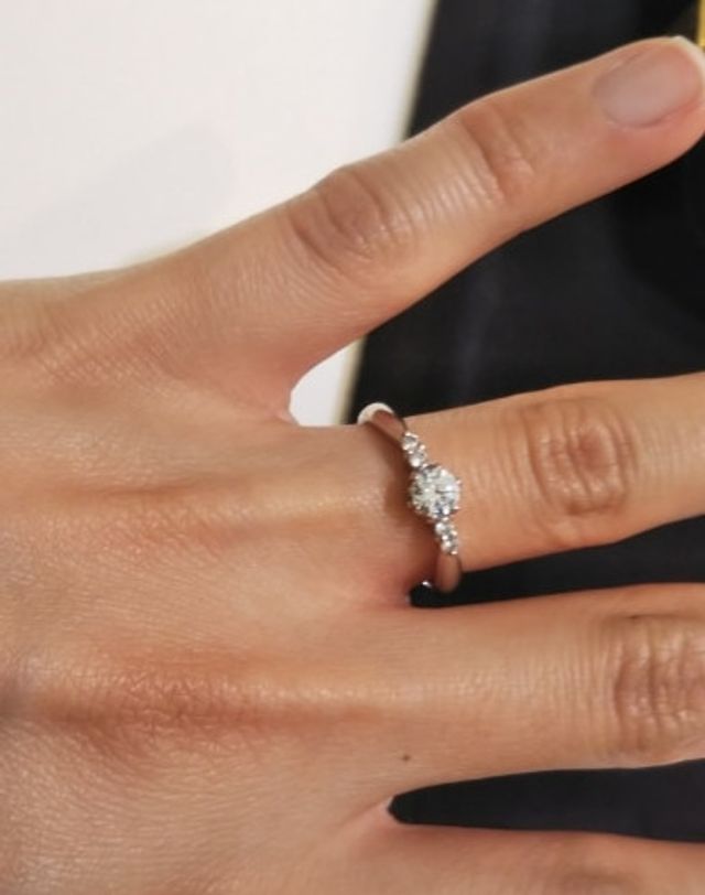 最初は予算の都合上ダイヤモンドが一石のエンゲージリングを希望していましたが、ガラジュエリーではメレダイヤが付いたものでも予算の範囲で選べることが分かり、色々と試着した中で一番自分の指にピッタリときたこちらのリングを選びました。