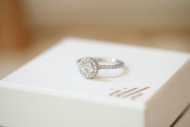 リングの台座が高く、結婚指輪などの他のリングとの重ね付けがしやすいデザインになっています。そして何よりも台座がかなりゴージャスで、ダイヤモンドが何倍にも大きく見えます。側面にも小さな石がちりばめられており、よりエレガンスを強調しています。