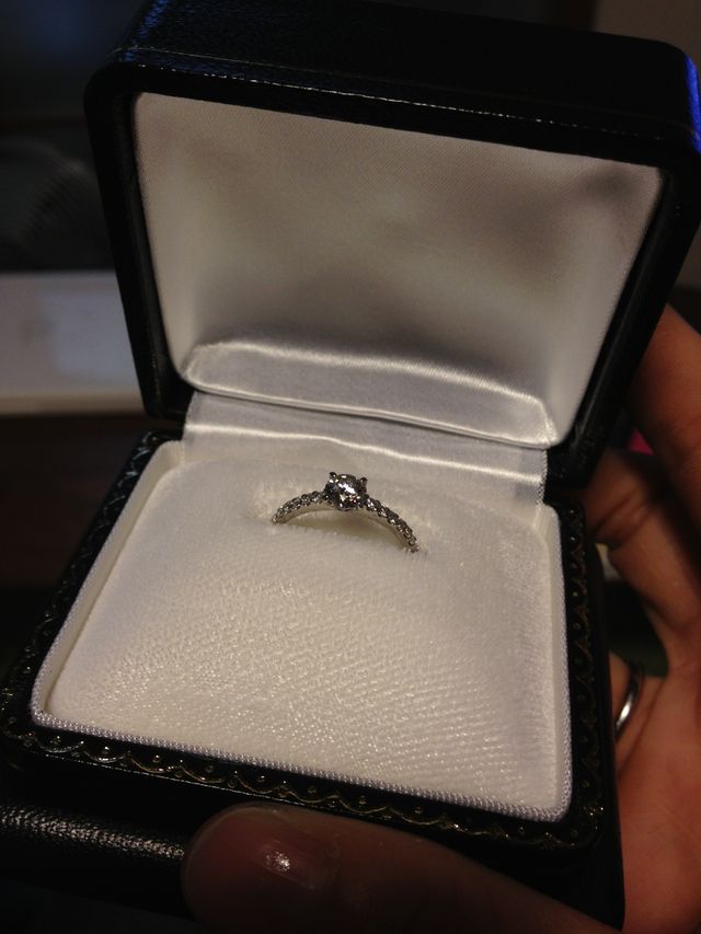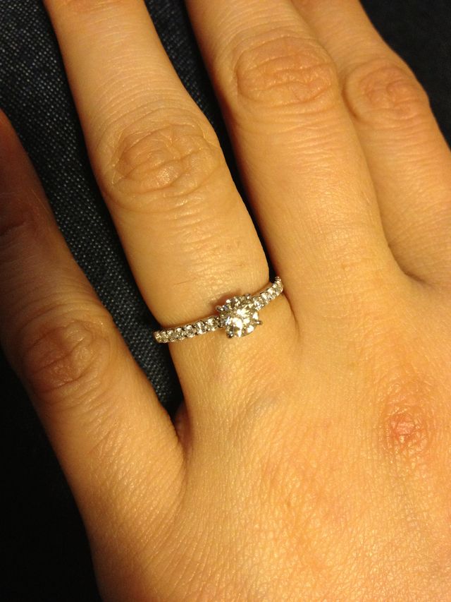 主人が私の知らない間に自分一人で選んで、サプライズでプレゼントしてくれました。私の希望は伝えてなかったのですが、好みのシンプだけど華やかなデザインで嬉しかったです。結婚指輪もストレートラインのシンプルなものにする予定だったので、一緒に合わせて付けるととても映えると思ったのが決めてだったようです。