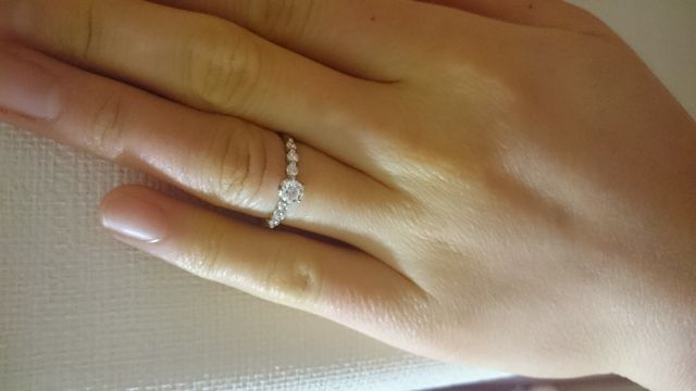 婚約指輪は、プレゼントではなく、夫と一緒に買いに行きました。私は指が太いのでなるべく、指が華奢に、綺麗に見えるデザインを選びました。大きなダイヤモンドが、中央にあり、そのサイドをやや小粒なダイヤが囲んでいるデザインは、年齢を問わずに着けることができるということでこの指輪に決めました。