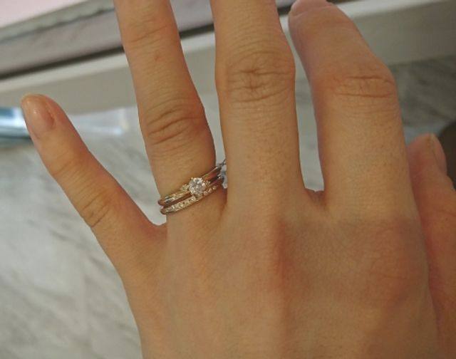 セットリングを探しており、このセットは特にキラキラと輝き存在感があって気に入りました。個性的なデザインでかわいらしい印象がありますし、プラチナとピンクゴールドの色合いのバランスが上品だと思います。また着け心地も滑らかでよいです。