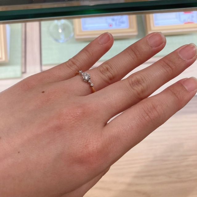 指が細いため、ウェーブかストレートのリング細めに絞って探していました。5つのダイヤが一直線に並ぶデザインが候補の中で一番華やかに見えたのでこちらを選びました。