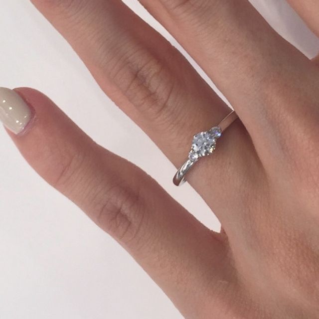 中央の大きくしっかりとした存在感のダイヤモンドがお気に入りです。全体的にはシンプルなデザインなので上品な印象ですし、サイドのメレダイヤの輝きはきれいです。プラチナの滑らかな質感も良く、指へのフィット感が抜群です。