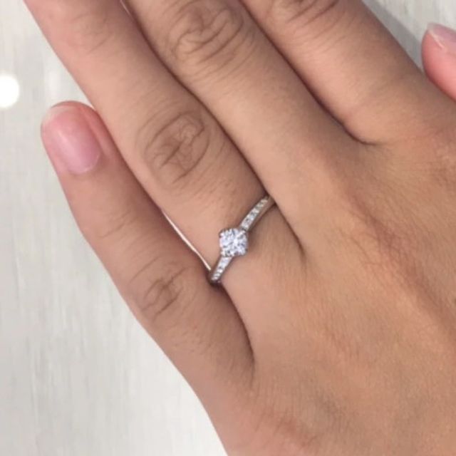 キラキラとした存在感が十分に感じられるリングであり、センターのダイヤだけでなくサイドのメレダイヤもしっかりと輝いています。また金属部分は滑らかでつけ心地が優しいので着けやすいですし、サイドのダイヤが斜めに付いているのもオシャレだと思います。