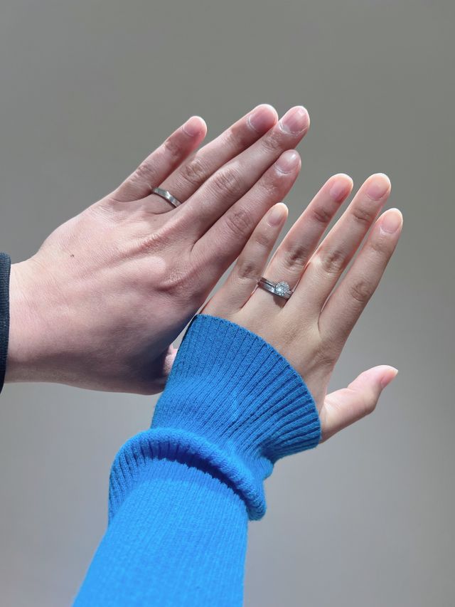 重ね付けができるタイプがよかったので、婚約指輪をつけるとダイヤが結婚指輪に被さる形になるのでとても綺麗で理想的な重ね付けです。指輪の厚みがあまりないタイプなので、何か握った時やグーにした時に違和感を感じないのもおすすめです。