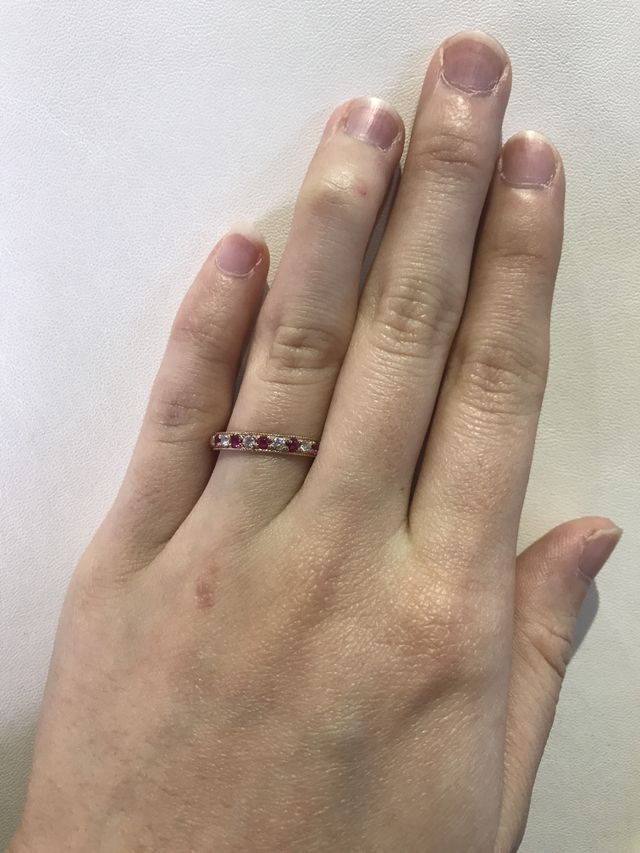 ルビーの色がたくさんあり、その中から自分好みの色も選べます。素材の色もプラチナと迷いましたが、ピンクゴールドとルビーの相性がいいということで気に入りました。何より他のルビーとは違う、一切加工していないありのままのルビーというところが本物って感じで、決め手になりました。