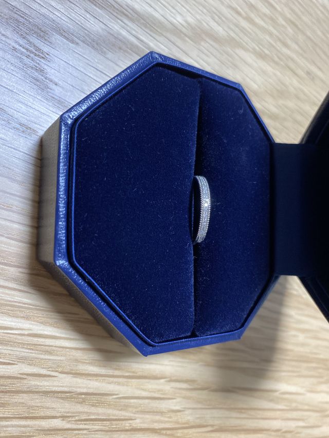 主張しすぎないけど華やかさがあるイメージでした。シンプル過ぎずとてもちょうど良かったです。サイズ直しなどの保証もきちんとあり安心できました。刻印も色々なマークに対応してて自分たちは猫のマークを入れてもらいました。