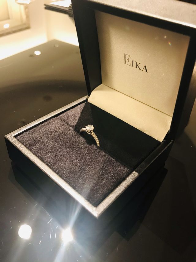 プロポーズでダイヤをプレゼントして頂いたあと、ダイヤが映えるようシンプルな形でありながら、リング自体にもダイヤがありどの角度から見ても素敵!と思いこの指輪を選びました。リングにもダイヤ埋め込まれいるデザインなの手元のきらりと光る輝きに惹かれました