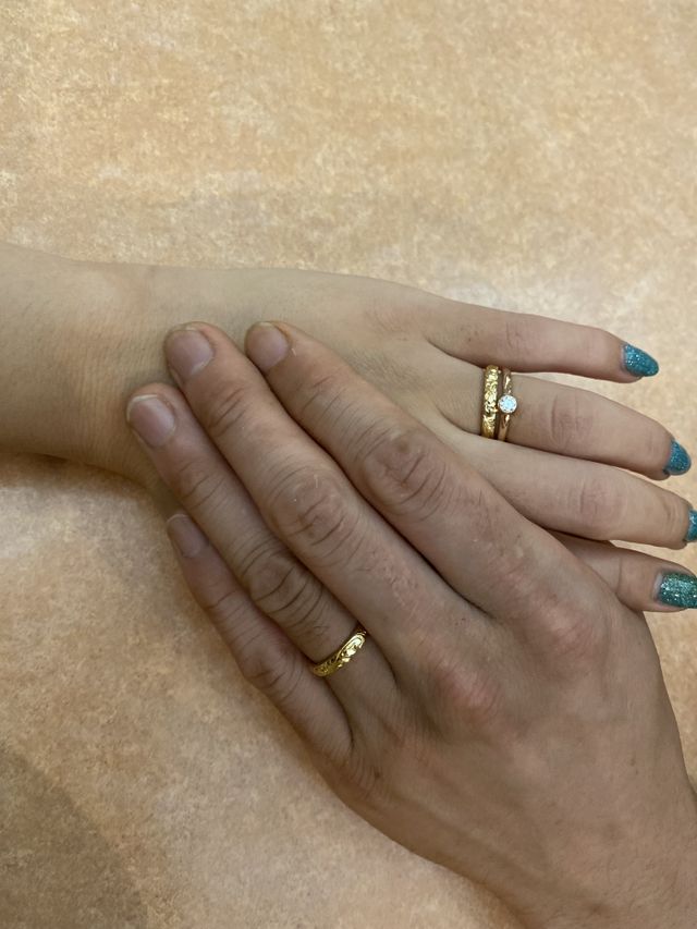 ずっとハワイアンジュエリーに憧れがあり担当さんがハワイアンジュエリーに詳しい方で思い切って結婚指輪をハワイアンジュエリーにしました。担当さんが親身になってくれて、いろんな提案をしてくださり普段使いできるデザインの婚約指輪をピンクゴールド結婚指輪をイエローゴールドにし満足のいく指輪を制作することができました。