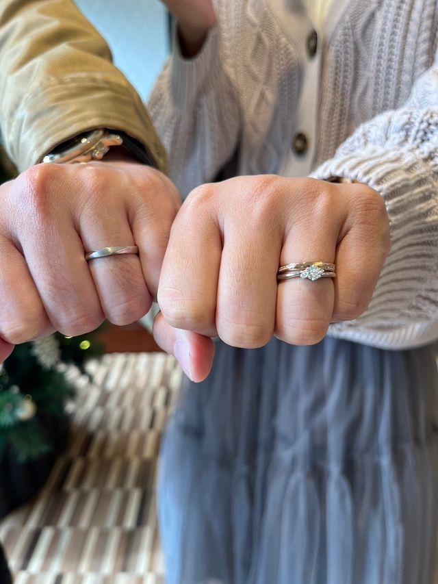 結婚指輪と合わせられるように捻りのあるものを選びました。ダイヤを支える部分が花になっていると聞いて可愛いなと思って選びました。リングの太さは少し細めでダイヤに近い部分が絞ってあるので着けても指輪が細く見えると感じています。