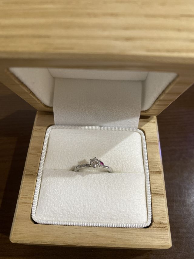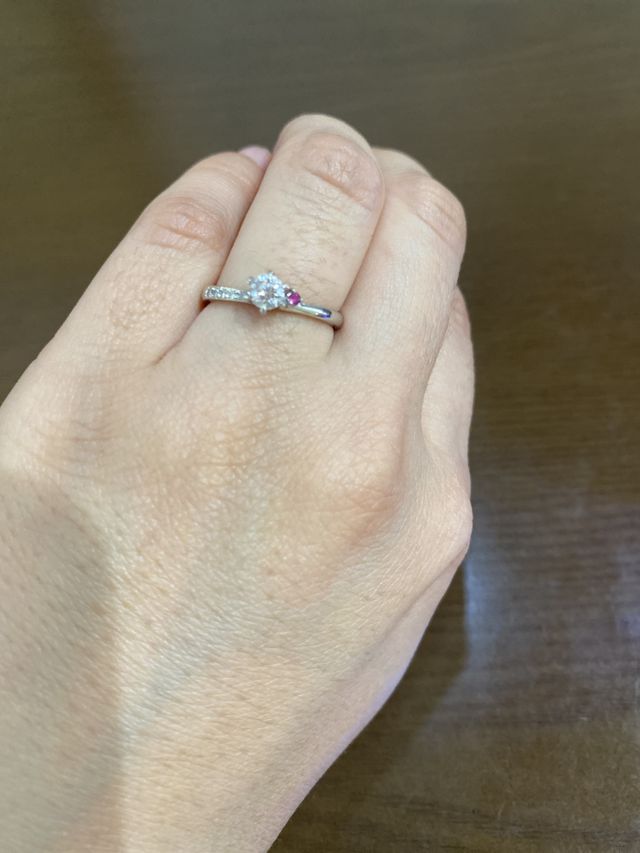 ダイヤモンドの横に小さな赤いルビーがあしらってあり、一目見てかわいい、付けてみたいと思えるデザインだったからです。また、山陰の神話の、因幡の白兎をモチーフにしており、結構指輪と重ねてつけるとうさぎの横顔になるというのも気に入った理由のひとつです。