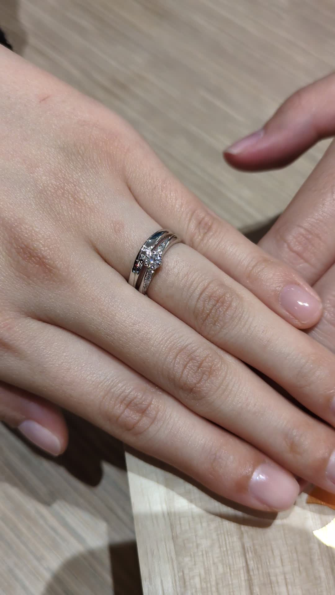 私は元々、『品』の婚約指輪・結婚指輪で揃えたいと思い、店舗に伺いました。しかし、店舗で実際につけてみて、婚約指輪を『波』結婚指輪を『品』にしました。柔らかなラインと、着け心地の優しさ、婚約指輪の品のいい輝きが気に入りました。また、重ね付けした際のフィット感も気に入り、この指輪を購入しました。シンプルではあるけれど、石が大きくなくとも光を受けたときにキラキラとかがやく素敵さがあります。