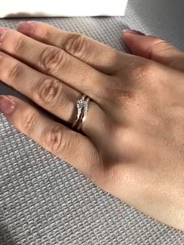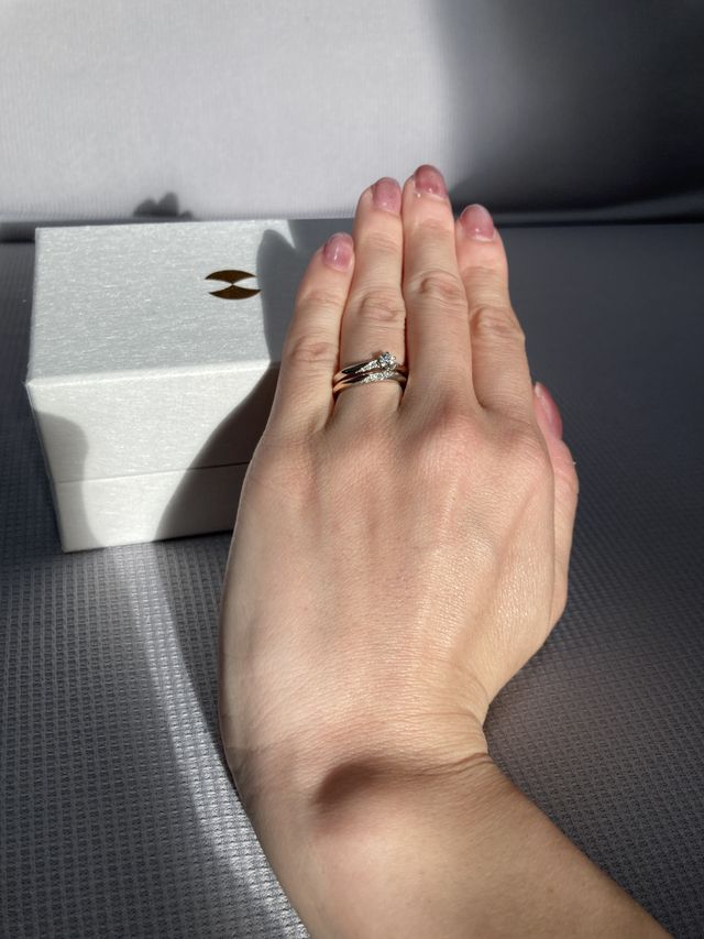 彼女に贈る婚約指輪として選びました。シルバーとゴールドの色味が絶妙で、上品だけど可愛さもある雰囲気です。メインのダイヤは想像以上に綺麗で、周りのダイヤがほどよく光って全体のバランスがとても良いと感じました。結婚指輪との重ね付けも自然で、実際に彼女が着けた時の手元がとても華やかになって、選んで本当に良かったと思っています。