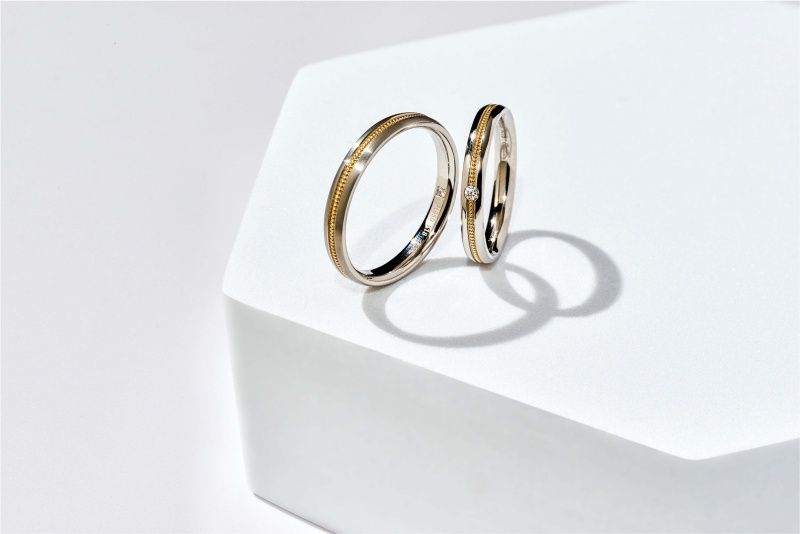 均一に施したイエローゴールドのミル打ちがアクセントとなり、コンビネーションを引き立てるデザイン。