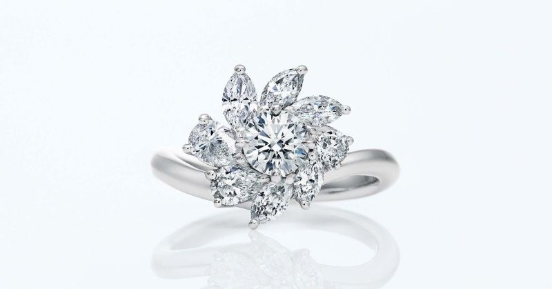 5粒のファンシーシェイプダイヤモンドがその5文字を表し、花冠のデザインに。幸せな結婚を誓い合うエンゲージリングに仕上がっています。
