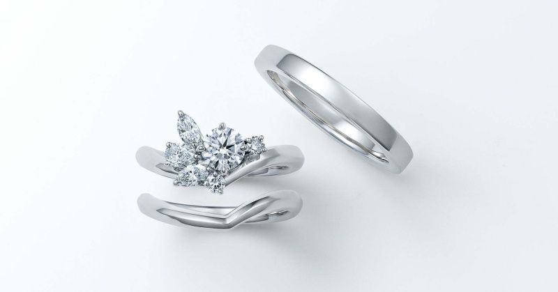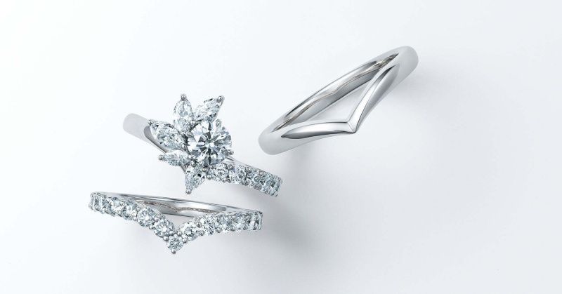 それに合わせるのは、ふたりの愛のはじまりを優美な光彩の軌跡で包みこむ、固く結ばれたV字のマリッジリング。