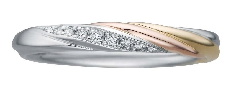 花びらが散りゆく様子をエンゲージリングに、そして気持ちが通じ合っていく様子をマリッジリングに3色のマテリアルで表現しています。