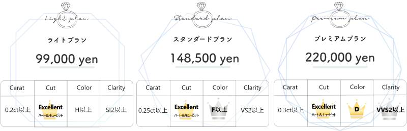 商品は、予算に合わせて選べる3コースを用意。ダイヤモンドのグレードや価格など、「わかりにくい・聞きにくい」が明確化されているので、店舗での対面による相談がなく不安という方でも安心です。