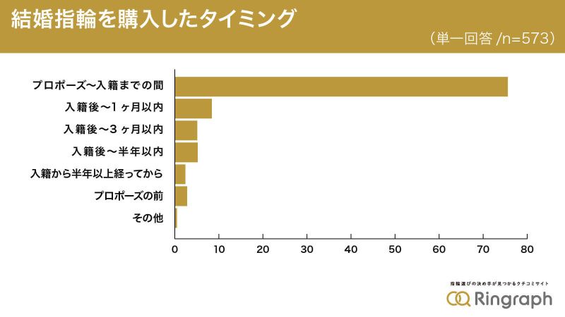 アンケートによると、「プロポーズから入籍までの間」に購入したという方が約8割。一般的には、入籍までに結婚指輪を用意する方が多いようです。