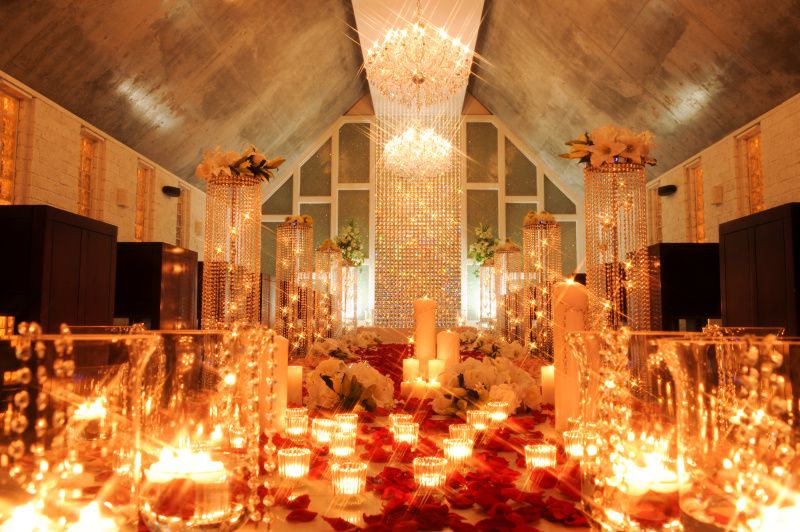 火を灯す本物のキャンドルだとドレスが燃えないか心配になりますが、キャンドルのような照明を活用すれば、新郎新婦も安心して歩けます。