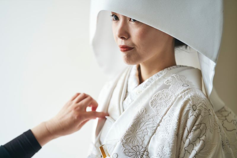 綿帽子は和装におけるウエディングベールのような役割があり、式が終わるまで新郎以外に顔を見られないために被ります。数ある和装のなかでも白無垢だけに合わせられるアイテムであり、色打掛では使用できません。