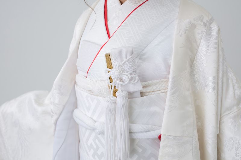 白無垢とは、全身をすべて白で統一された和服の婚礼衣装です。婚礼衣装のなかで最も格式が高く、室町時代には武家の婚礼の儀式で着用されていました。打掛や刺繍も徹底して白でまとめられており、縫い糸・小物・装飾品・帯などのアイテムも真っ白です。
