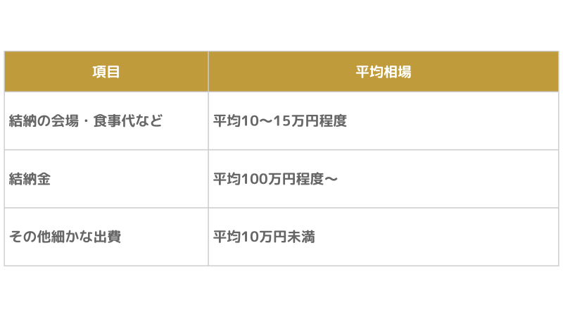 結納金の平均的相場は100万円〜となっており、決して簡単に用意できる額でも少ない額ではありません。さらに結婚式を行う場合、式とは別で用意する費用のため、かなりの経済的負担となります。