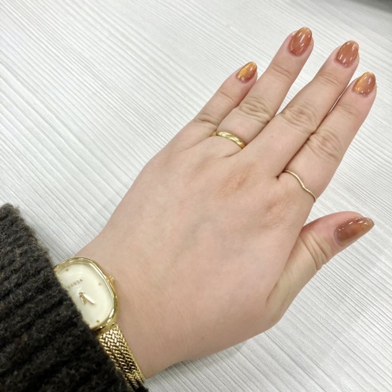 指輪の太さで印象が変わるのもポイントで、太いウェーブリングは個性的な印象を、細いウェーブリングは繊細で華奢な印象を与えることができます。