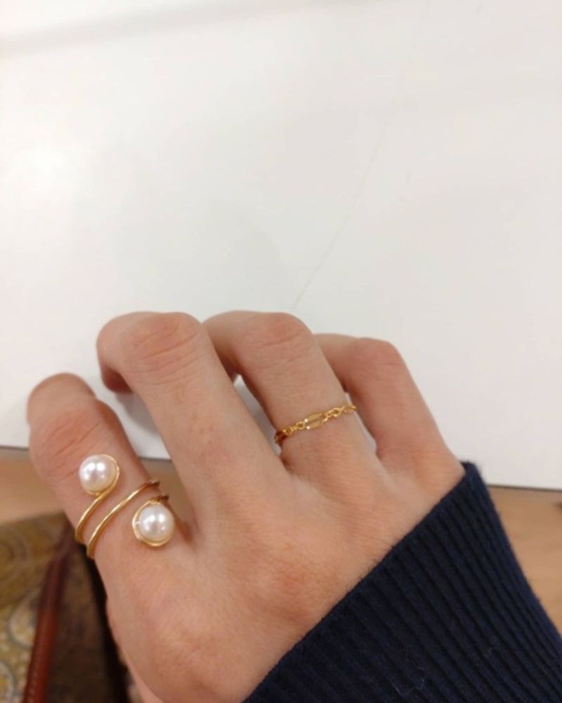 おしゃれなパールリングは、1本のみでの着用はもちろんのこと、素材の質感や色が異なるリングとの組み合わせで、より個性的なスタイルを楽しむことができます。