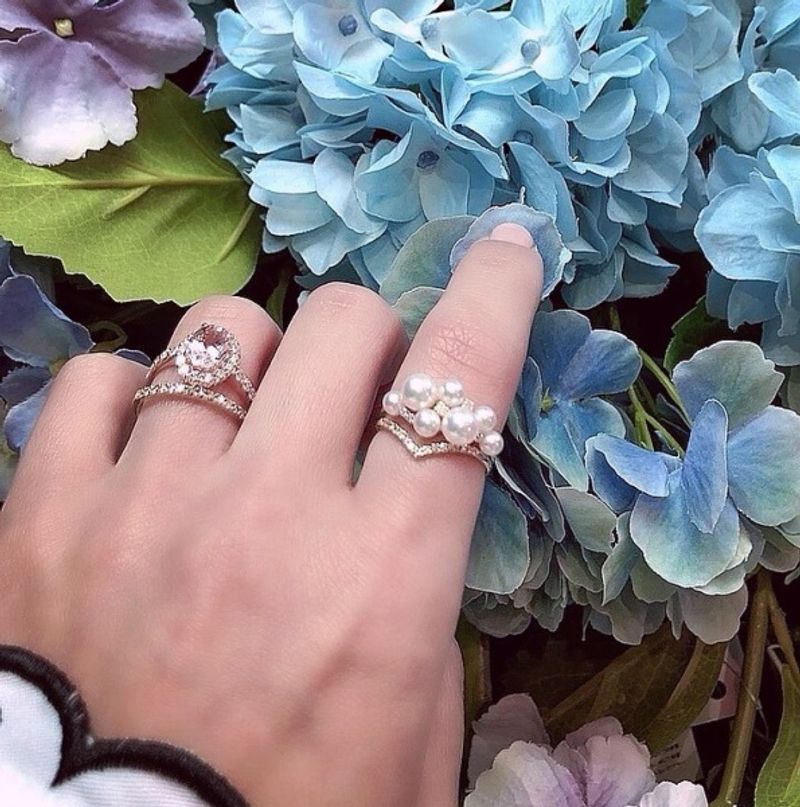 パールとV字のラインアームのリングを重ねた人差し指と、薬指には華やかなビジューのリングを組み合わせたおしゃれなコーディネートです。