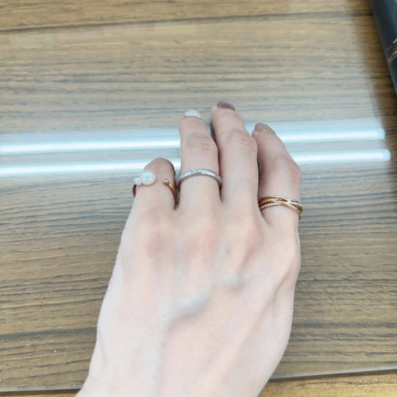 細い指輪は、重ね付けや複数付けがしやすいので、何本も欲しくなってしまいますよね。華奢な指輪は、3本くらいまとめてつけるとボリューム感が出ます。