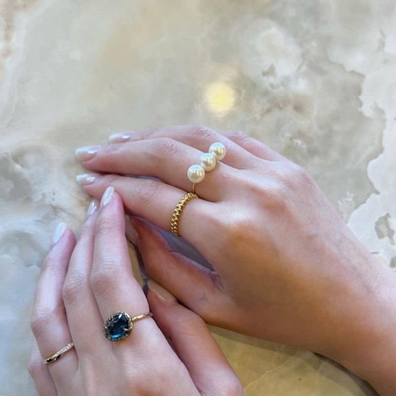 ストレートリング、カラーストーン、デザインリング、パールとさまざまなテイストの指輪を合わせたハイセンスなコーディネート。地金がゴールド系で統一されていることもあり、統一感があり素敵です!天然石やパールのデザインリングがあると、エレガントな印象に。