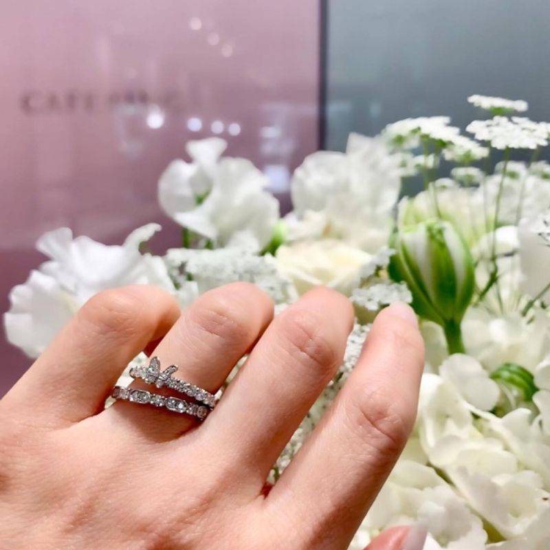 蝶のモチーフが素敵なファッションリングと、結婚指輪を組み合わせたコーディネート。華やかさと遊び心のある組み合わせで、ちょっとしたお呼ばれや結婚式などにも最適です。結婚指輪と素材やカラーを合わせた少し大きめのモチーフを取り入れることで、女性らしい華奢な指先を演出できます。全身コーディネートのアクセントにも◎