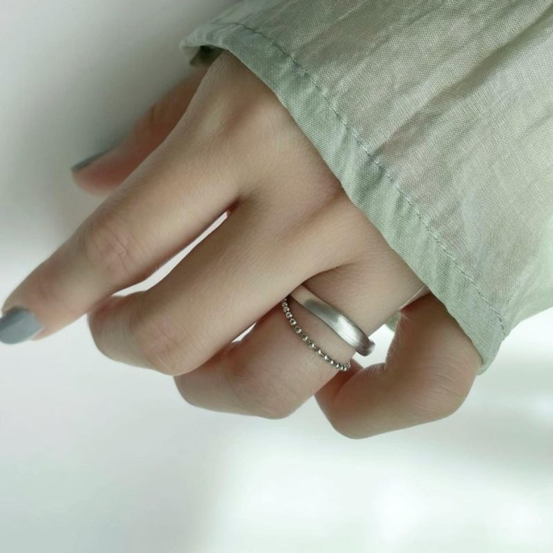 ファッションリングの中でも、カジュアルな雰囲気をもつビーズのようなデザインのリングを組み合わせたコーディネート。細身のチェーンリングは、どんなデザインにも合わせやすく、存在感が強すぎないのがポイントです。