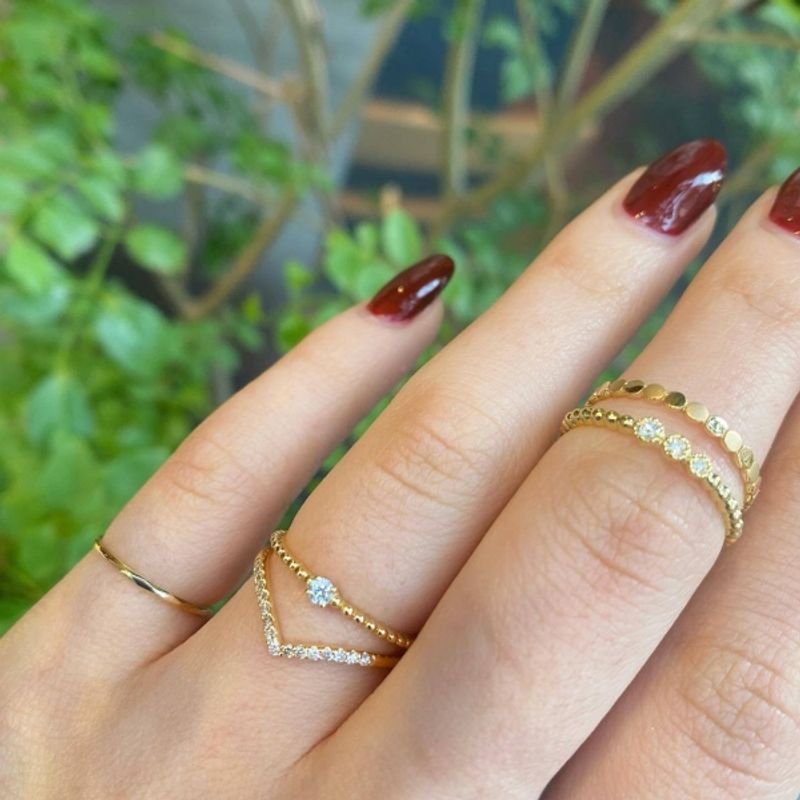 細身のファッションリングなら、重ね付けもしやすいので、結婚指輪はもちろん、ほかのお気に入りのリングと合わせてコーディネートしてみると良いでしょう。