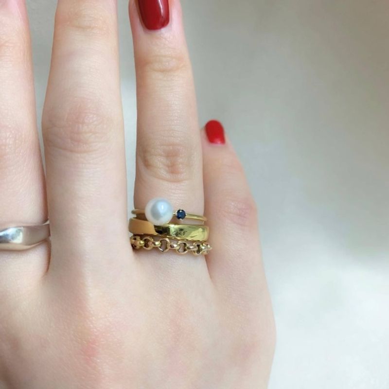 パールやカラーストーンなどのカジュアルなデザインと、細身で華奢なリングと組み合わせたコーディネート。地金の色味を揃えると、カジュアルなデザインのファッションリングであっても馴染みが良く、マリッジリングとの重ね付けとしておしゃれな印象になります。