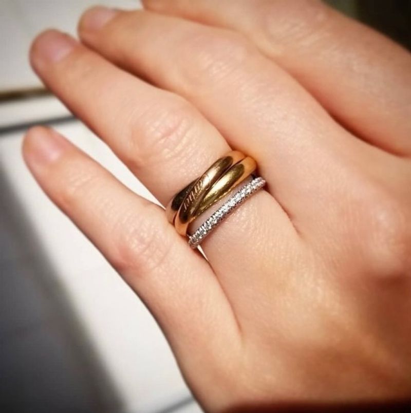 カルティエのトリニティリングとエタニティリングのコーディネート。大人ならではの洗練されたムードのある組み合わせです。ボリューム感が真逆なリングを組み合わせて遊び心をプラスし、カジュアルながらも大人っぽく上品なムードを演出できます。