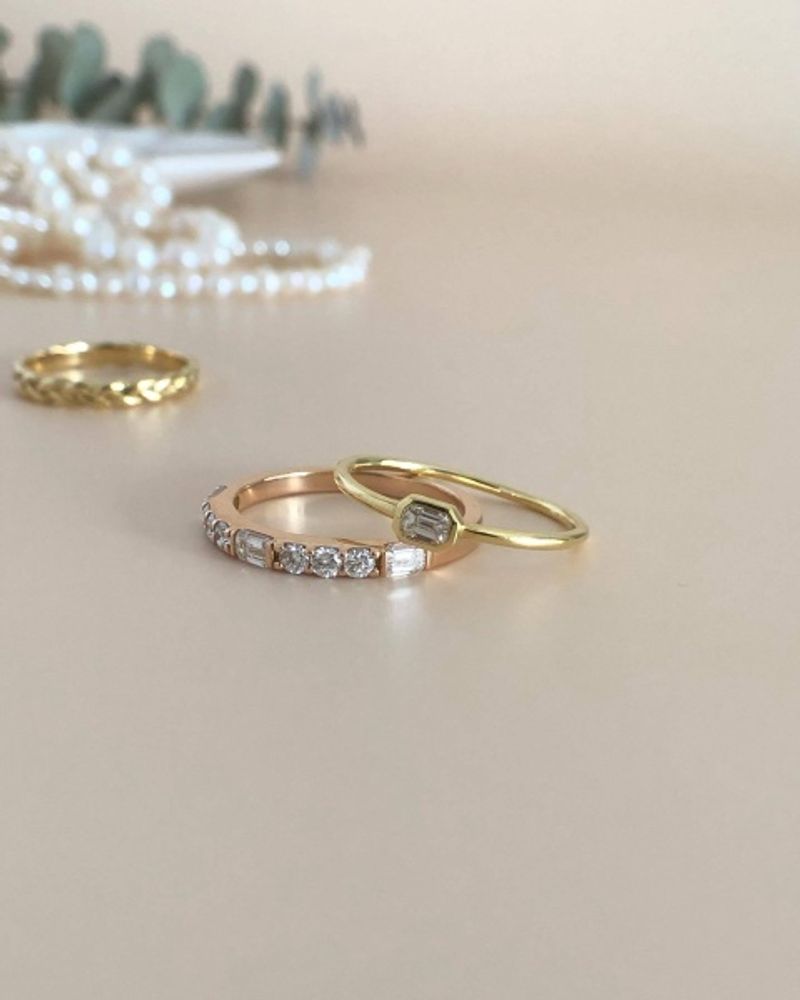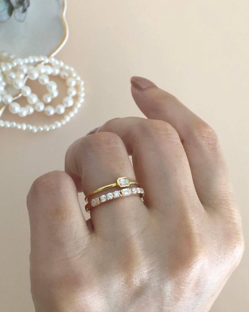 エメラルドカットで地金細めのリングと2連の遊び心が素敵なデザインリングとの重ね付けのコーディネート。ゴージャスなだけではなく、それぞれのリングの存在感が生かされた組み合わせです。エタニティリングが細身な分、他のリングは少し派手目なものにするとバランスもよく華やかな手元になるでしょう。