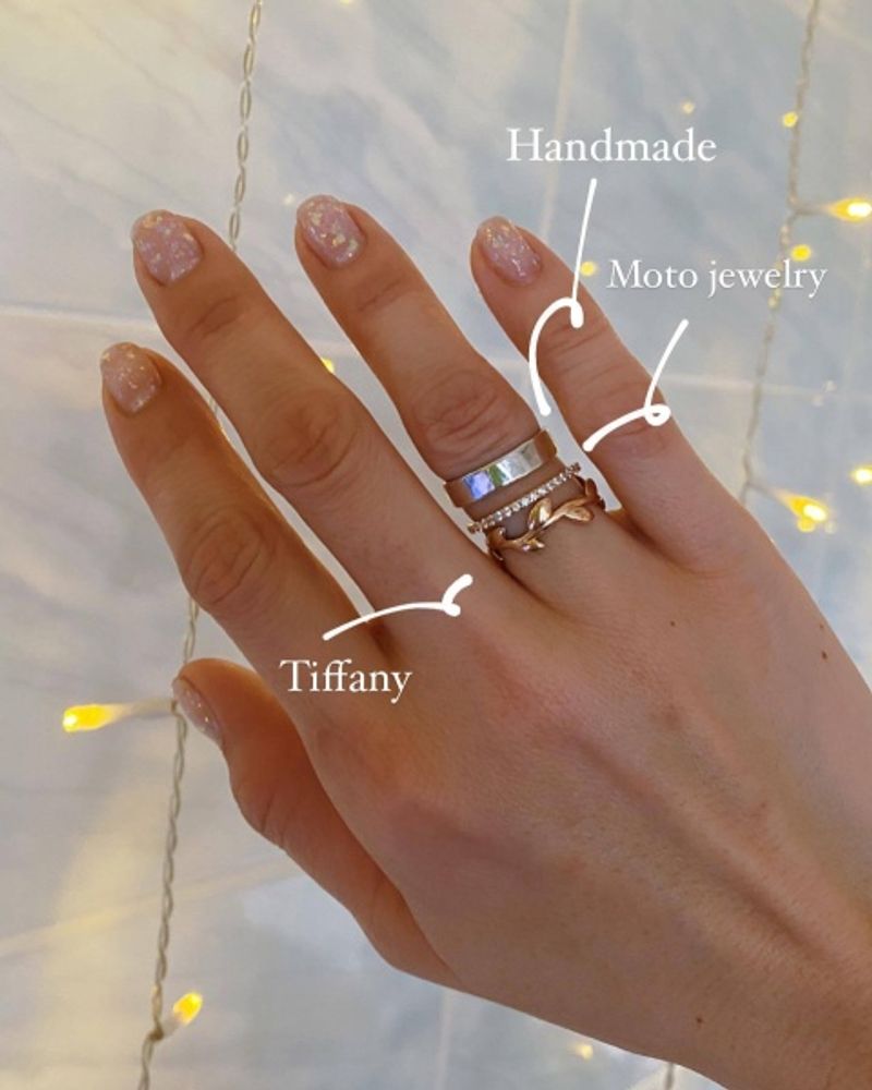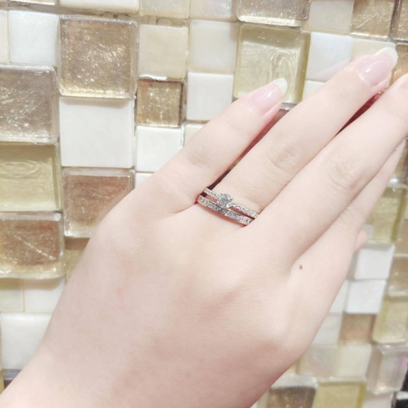 近いデザインの指輪をあわせることで統一感も出て、おしゃれな印象になります。