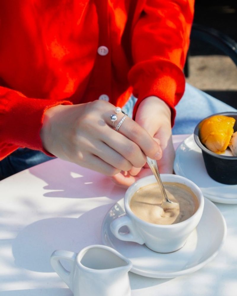 パールリングや宝石付きのリングとのコーディネートは、手元の良いアクセントに。手元の写真を撮った際にも遊び心があり、こなれた印象を与えてくれるでしょう。地金の色を揃えると統一感があり、揃えずに別の色味にすることですこし個性的でジュエリーを楽しんでいる雰囲気を演出できます。