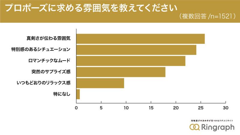 アンケートでプロポーズに求める雰囲気を選んでもらったところ、「真剣さが伝わる雰囲気」と「特別感のあるシチュエーション」がほぼ同数で人気に。その次に「ロマンチックなムード」が選ばれました。