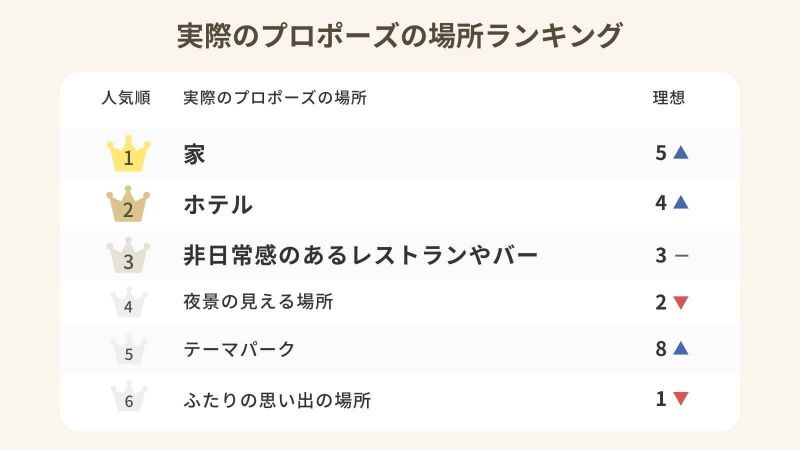 「実際にプロポーズをされた場所」と「理想のプロポーズの場所」の人気順の差で見てみると、理想のプロポーズの場所の際は「家」の人気順は5番目だったので、女性の理想とは少しギャップがありそうです。