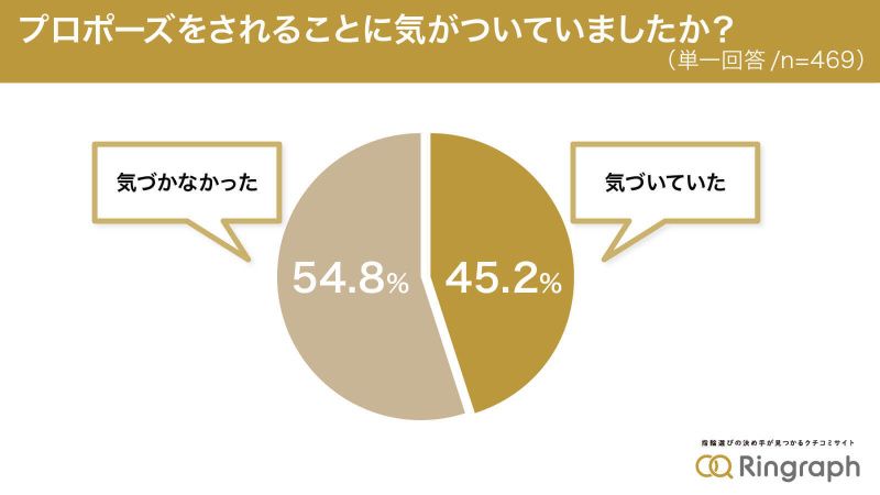プロポーズに事前に気づいていたかという質問では、半数ずつだったので、サプライズプロポーズに憧れる方も多いようです。