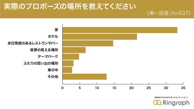 意外にも、場所にはこだわらないという意見も一定数ありました。プロポーズをしてもらえること自体が女性にとっては嬉しいものですし、場所よりも”自分のことを想って考えてくれたこと”が大切と考える方が多いようです。