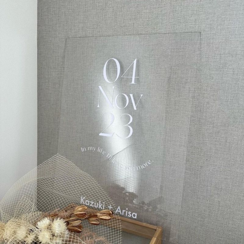 アクリル板に挙式の日付と名前。そして当日のBGMでも使われていたというThe Beatlesの一節「In my life, I’ll love you more. 」を文字入れしたシンプルながらこだわりのデザイン。クリアな質感とシンプルなデザインで抜け感のあるお洒落な雰囲気に仕上がっています。