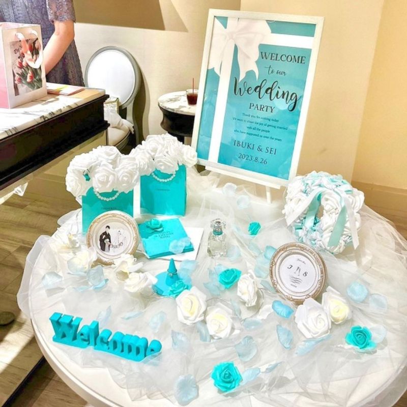 ウェルカムボードをはじめとしたウェルカムスペース全体をティファニーブルーとホワイトで統一。潔く2色のみで作り上げたウェルカムスペースは華やかかつ大人っぽく仕上がっています。