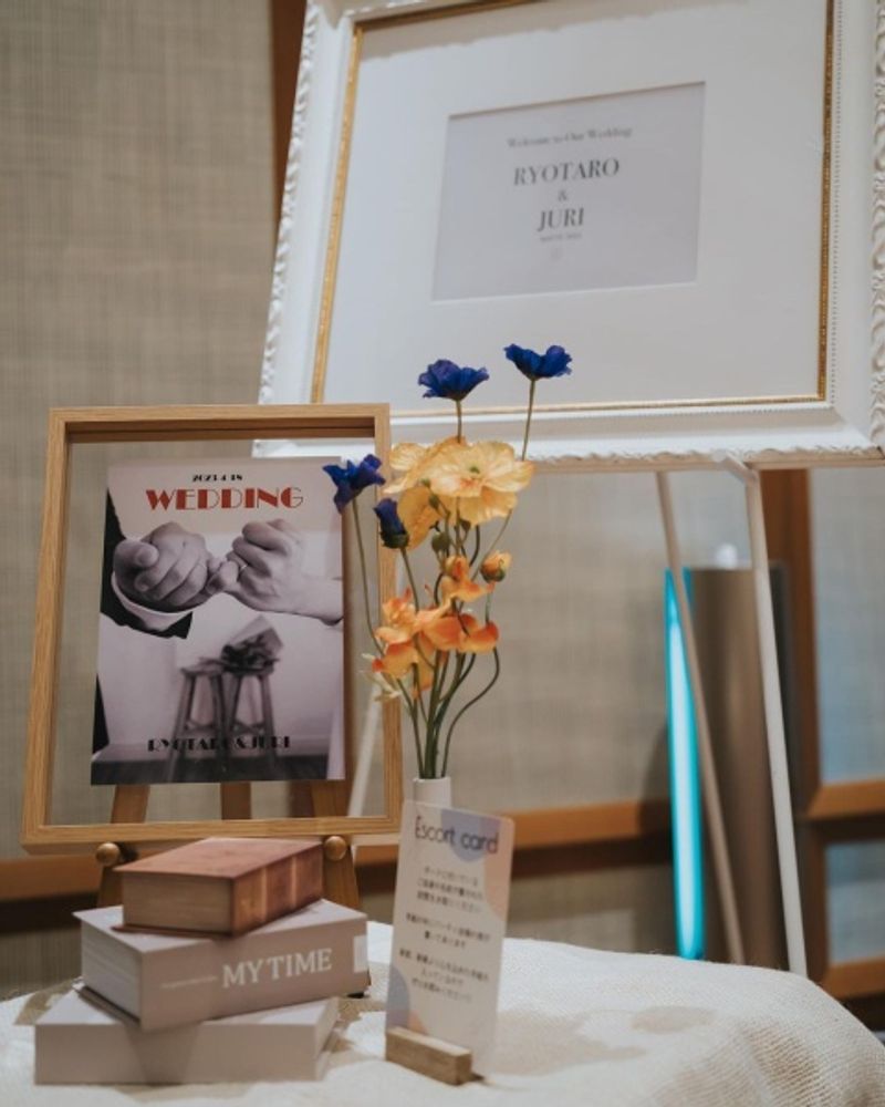 ウェルカムボードにはふたりの写真を、フレームの中には写真とイラストの双方を使うことで思わずゲストが見入ってしまうデザインになっています。