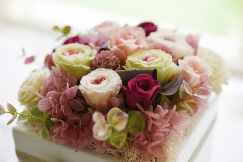プリザーブドフラワーとして保存するメリットは、お花の美しい形状を保ったまま保存できること。水やりの必要もなく、インテリアとしても華やかです。